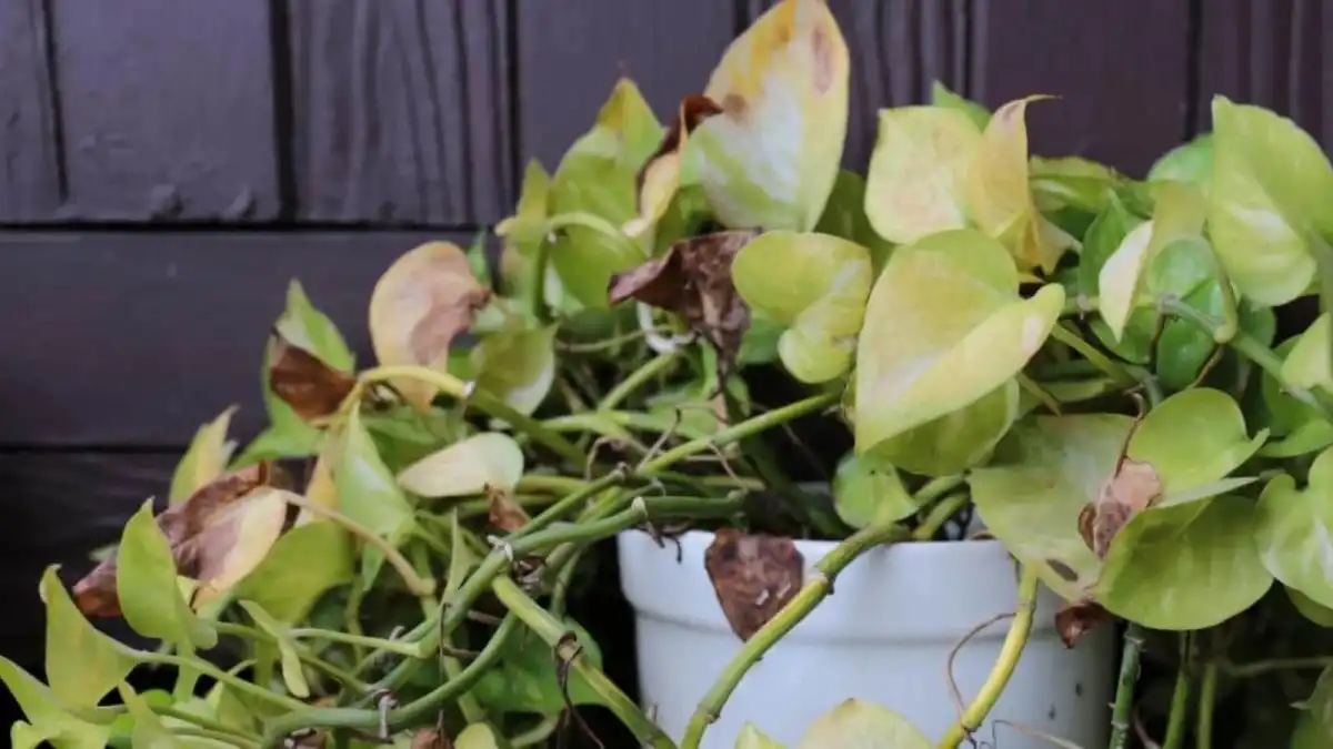 Краї листових пластин коричневіють, підсихають, можуть утворюватися коричневі плями на поверхні листя. Причина: мізерний полив під час активного зростання ліан. Збільшіть витрати води при поливі або поливайте сциндапсус частіше.