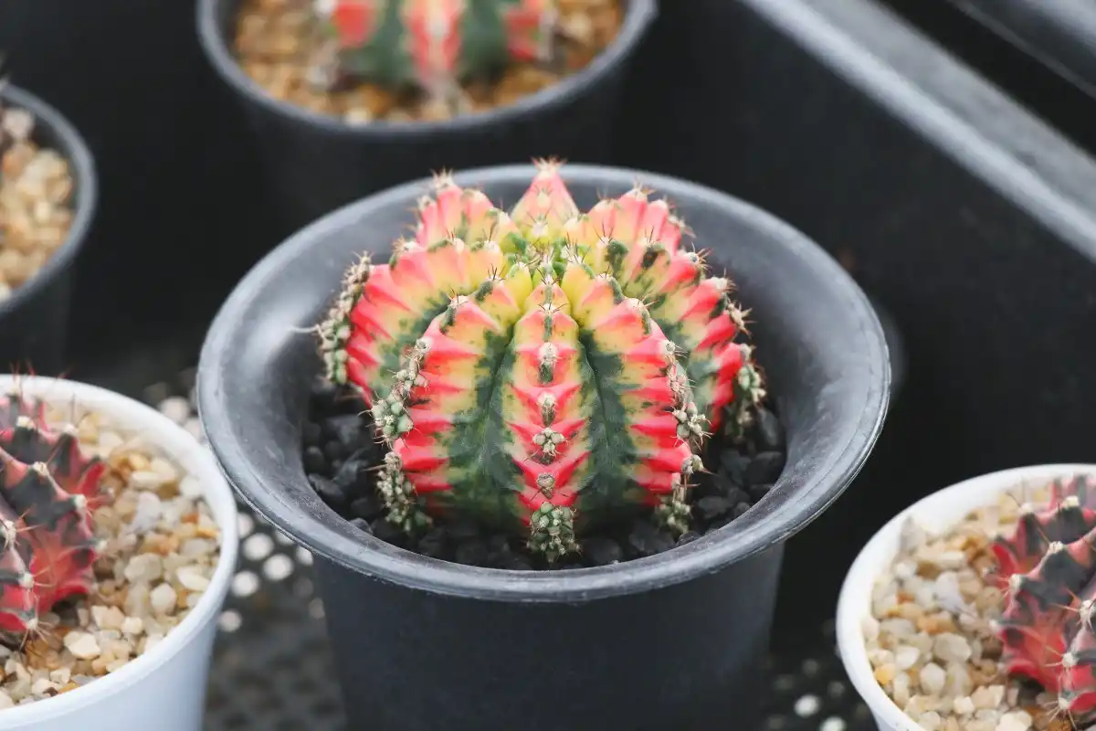 Щеплення цього виду має мутацію, яка призводить до нестачі хлорофілу. Завдяки цій особливості кактус набуває дивовижних забарвлень: червоних, помаранчевих або жовтих. Однак через мутацію такі кактуси страждають від нестачі хлорофілу і просто не можуть існувати самостійно (гинуть ще у розсадному віці). Тому їх доводиться прищеплювати до іншого зеленого кактусу, що містить хлорофіл.