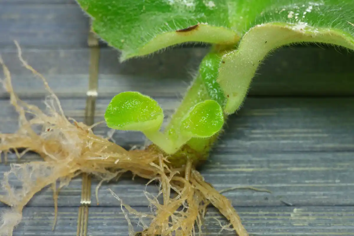 Тижня через два з'являться коріння, а ще через півтора місяці черешок обросте і корінням, і молодими рослинками. Тут починається ювелірна робота з відділення кожної крихітної рослинки з корінцями від черешка листа та посадки в індивідуальні ємності.