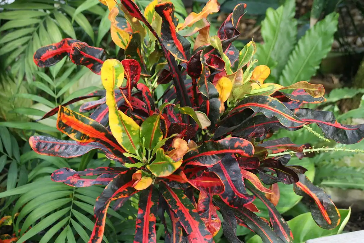 Якщо ви шукаєте кімнатну рослину, таку ж яскраву, як тропічний карнавал, кротон (Codiaeum variegatum) – те, що вам потрібне. Ці кімнатні рослини відрізняються яскравим строкатим листям у поєднанні зеленого, жовтого, помаранчевого та/або червоного. Якщо такого забарвлення вам недостатньо, є кілька рідкісних сортів, до складу яких також входять рожевий та фіолетовий. Листя у кротонів бувають різних форм, так що ви практично гарантовано знайдете поєднання форми і кольору, яке захопить всю вашу увагу.
