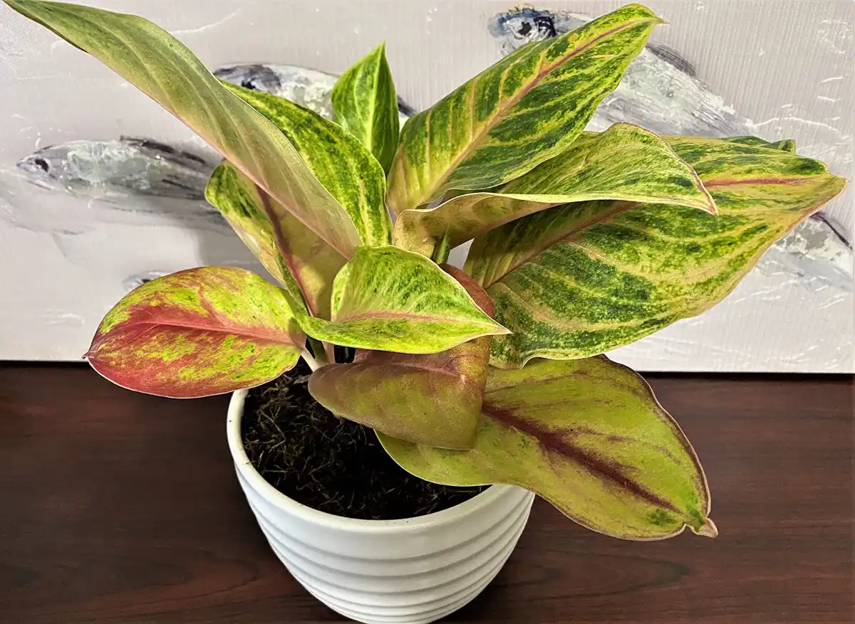 Аглаонеми добре відомі своїм розписним листям, а "Голден флюорит" (Aglaonema 'Golden Fluorite') - один з кращих її сортів. Жовті, зелені та білі відтінки надають блискучому листю мерехтливого вигляду. Додатковий акцент – рожево-червоні жилки у центрі листа.