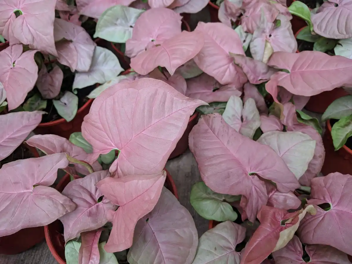 Красива кімнатна рослина, що легко вирощується. У сингоніуму приємне серцеподібне листя світло-зелених і курно-рожевих відтінків з яскраво-рожевими прожилками. Рослина може добре адаптуватися до флуоресцентного світла. Просто підтримуйте підвищену вологість для їхнього здоров'я.