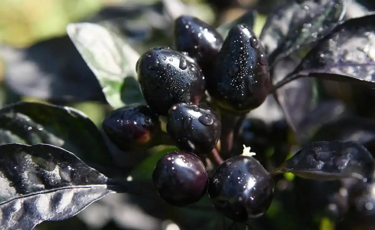 Перець з чорними глянцевими плодами, які виглядають вкрай ефектно на тлі зеленого листя. Він додає темний та екзотичний акцент при поєднанні з іншими рослинами.