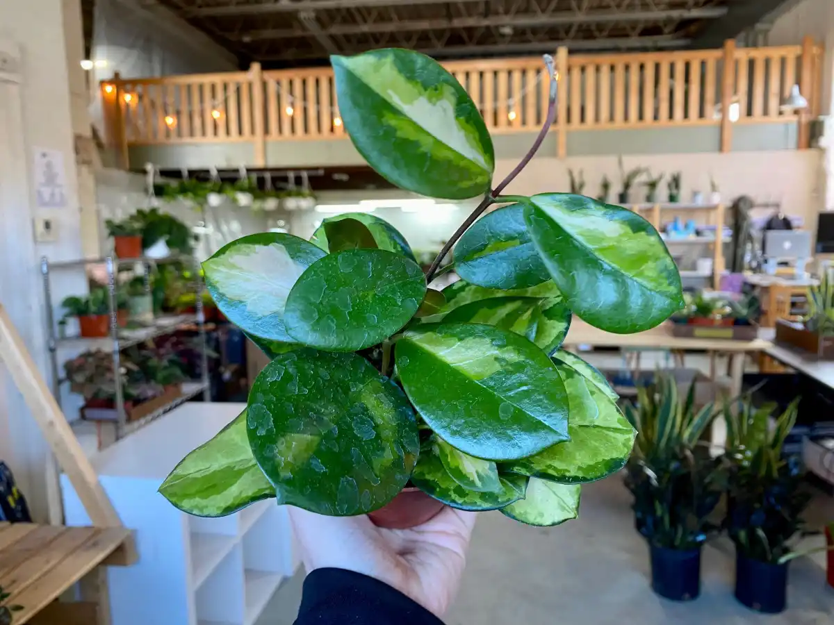 Це воскова рослина, яка приваблива через оригінальне забарвлення. Її еліптичне листя, блискуче, як у всіх воскових хой. Вони строкаті, з яскравим жовто-зеленим центром та плямами, які стають темнішими ближче до країв. Ви можете навіть побачити рожеві відтінки у листя.
