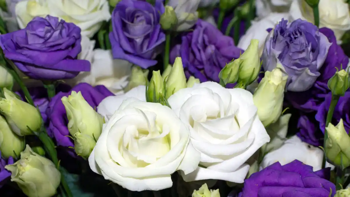 Це витончена ніжність статних, але при цьому дуже пухнастих кольорів, що легким градієнтом змінюють забарвлення від нижнього ярусу до маківки. Якщо знизу це крупненькі брошки з ніжних пелюсток білого, синього, фіолетового або рожевого кольору, то над ними височіють невеликі зелені бутончики, що приносять в загальну картину свіжості та витонченості. Своєю красою еустома радуватиме до трьох тижнів.