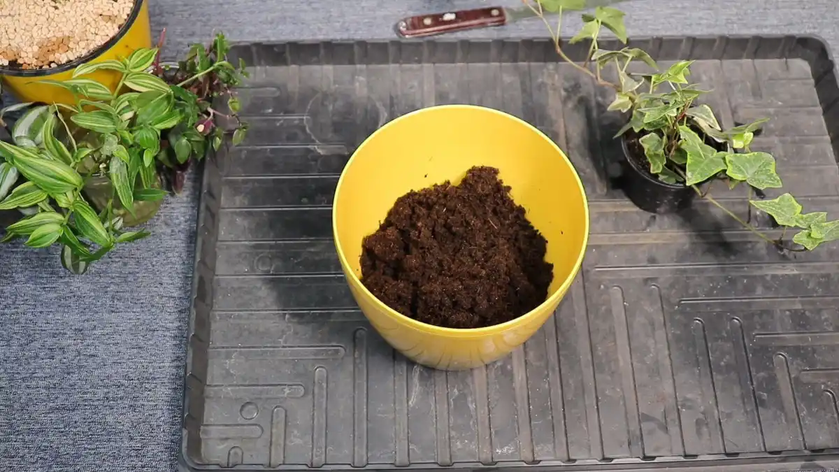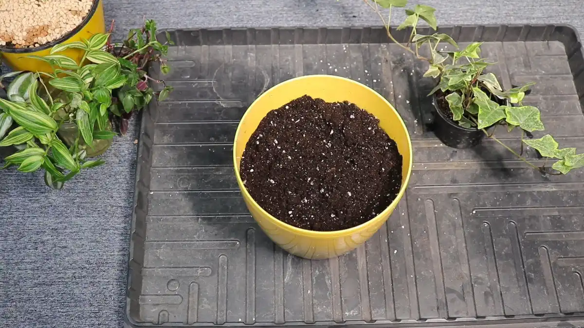 - Заповнити горщик придбаним у магазині готовим ґрунтом для плющої або самостійно складеної пухкої та слабокислої сумішшю із звичайного квіткового ґрунту та кислого верхового торфу (у пропорції 1:1)