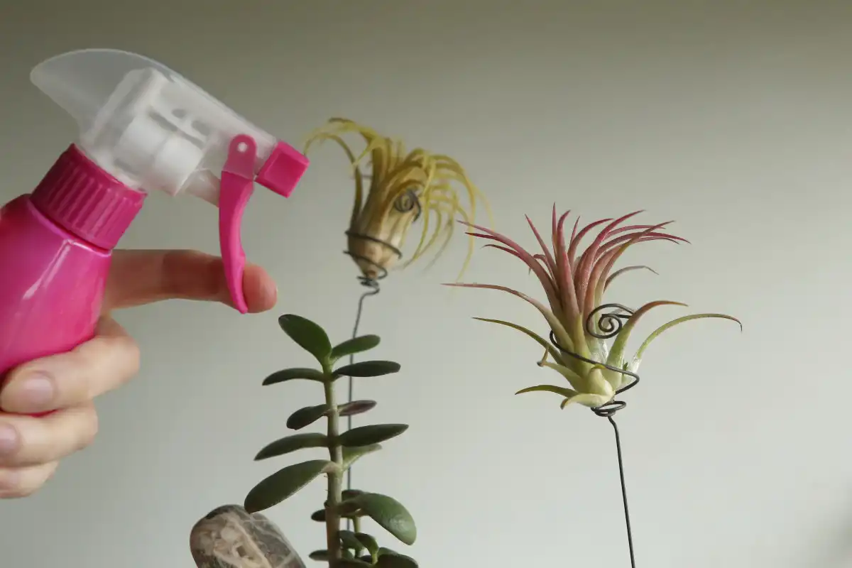 Крім обприскування, тиландсію потрібно ще й купати. Влітку це варто робити пару разів на тиждень, взимку можна рідше. Якщо рослині не вистачає вологи, вона про це підкаже – листочки почнуть скручуватися. Отже, треба терміново організовувати водні процедури.
