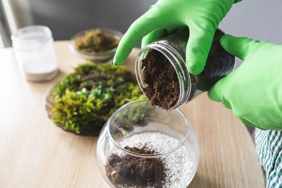 - На шар дренажу помістити шар ґрунту завтовшки 3-8 сантиметрів і зволожити його з розпилювача. Для того, щоб грунт не провалювався, можна використовувати прошарок сфагнуму або спанбонду.