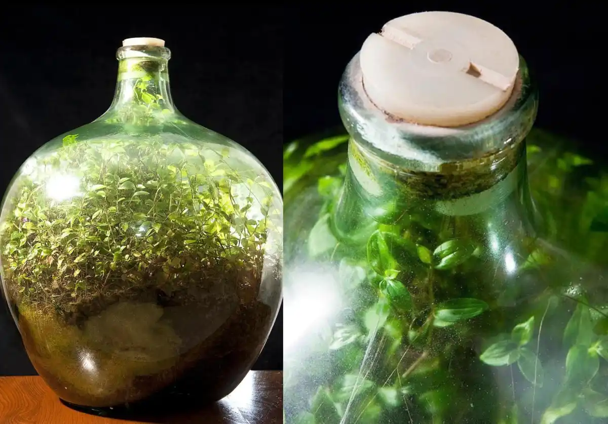 Найбільш складним є флораріум із замкнутою екосистемою. У його закритому просторі рослини випаровують вологу, вона конденсується на стінках судини, і краплі конденсату потім випадають дощем (міні кругообіг води в природі). Під час дихання рослини виділяють вуглекислий газ, з якого утворюються в процесі фотосинтезу поживні речовини та кисень. Загиблі рослини утворюють гумус, проростають нові. Спостерігати за цим надзвичайно цікаво. Це навіть може стати шкільним проектом з біології для Вашої дитини.