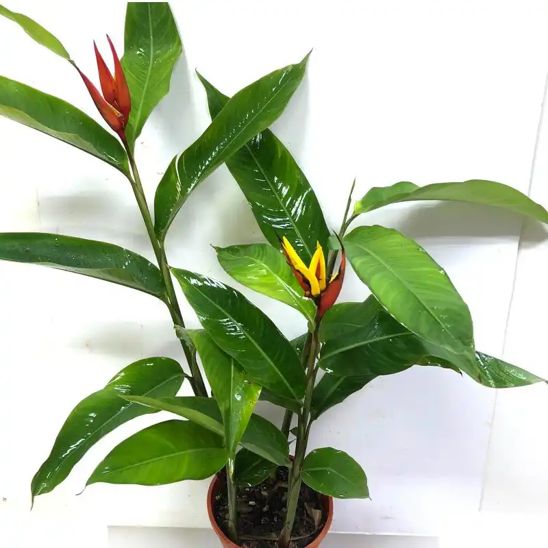 - Геліконія ростральна (Heliconia rostrata) - геліконія з «банановим» листям і густими суцвіттями з строкатими жовто-червоними, поникаючими приквітками.