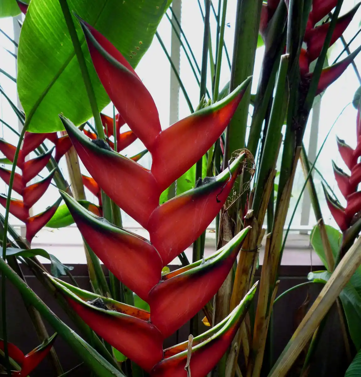 - Геліконія Біхаї (Heliconia bihai) - Великий вид з метровим листям і ефектними суцвіттями довжиною до 60 см з червонувато-жовтими, зеленими на кінцях, схожими на клешню краба приквітниками.