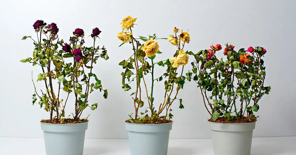 Регулярна ґрунтова посуха призводить до висушення листя, вони поникають, скручуються, стають тонкими, а в руках легко ламаються. У квітучих троянд також швидко в'януть і висихають бутони.