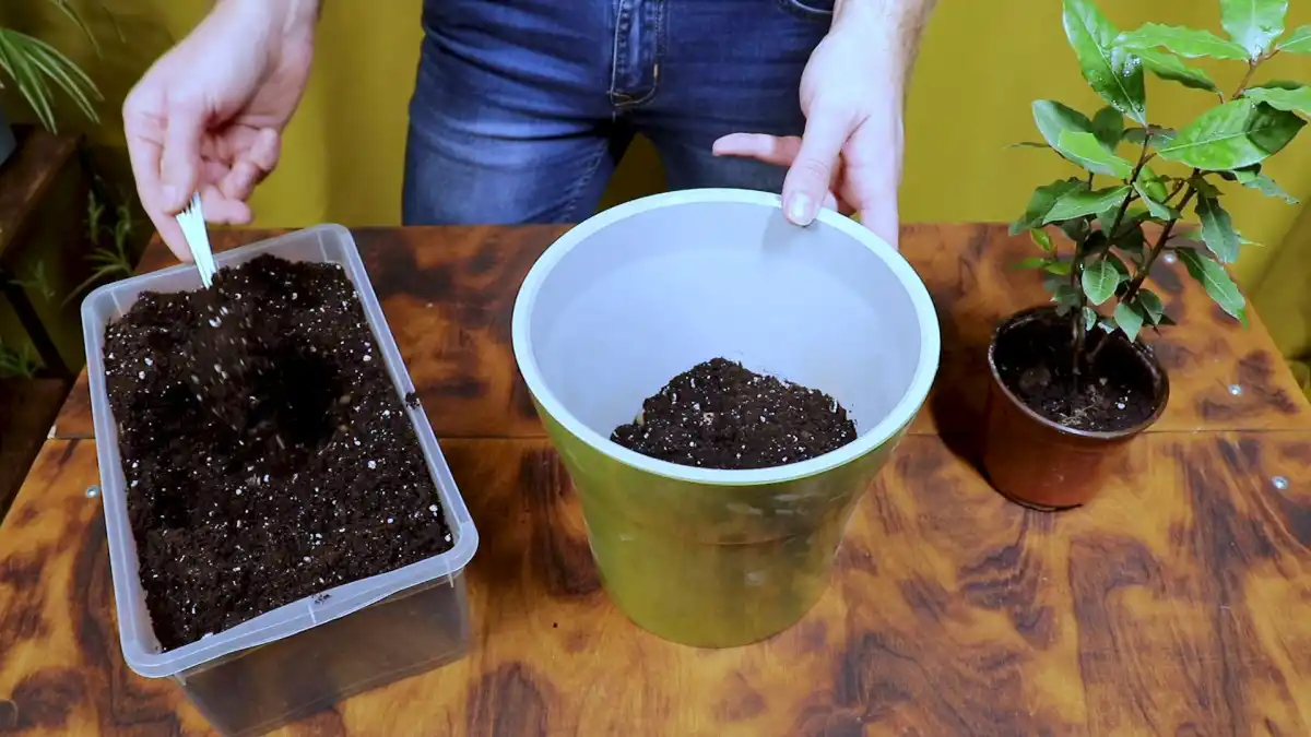 - Встановіть рослину по центру горщика. Рівень посадки лавра має збігатися з тим, на якому він зростав у попередньому вазоні. Не потрібно сильно заглиблювати або піднімати рослину при посадці.