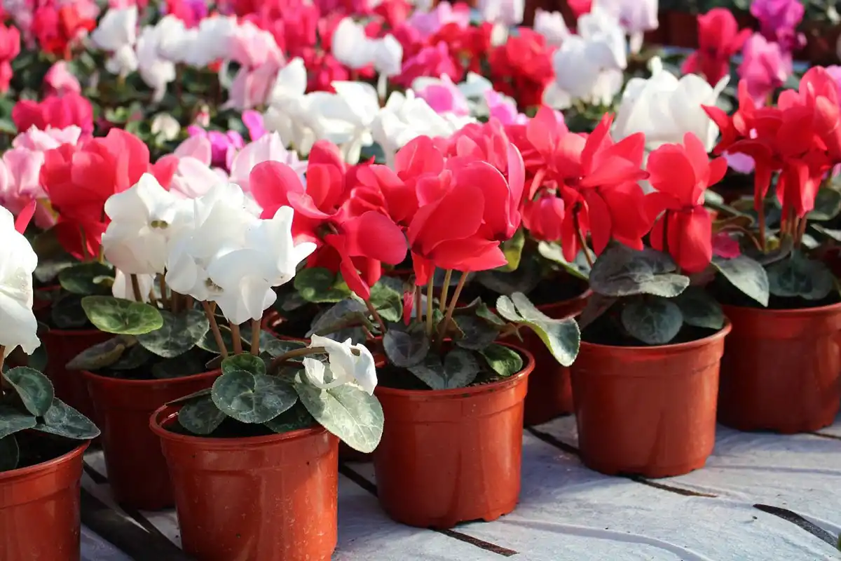 Ще один фаворит новорічної колекції – цикламен. Його численні квітконоси увінчані ніжними одиночними квітками, схожими на метеликів, і можуть мати різне забарвлення – від сліпучо-білого до пурпурового. Квіткарі особливо полюбили його за красу та легкість у догляді. Примітно, що в одному горщику можна вирощувати кілька різновидів цикламенів.