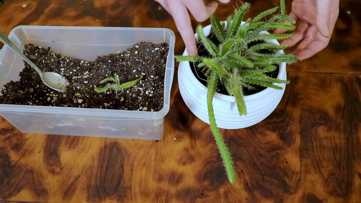 - Акуратно витягніть сіянець кактуса з ємності. Одягніть рукавички або скористайтеся паличками для суші, щоб не поколоти руки.