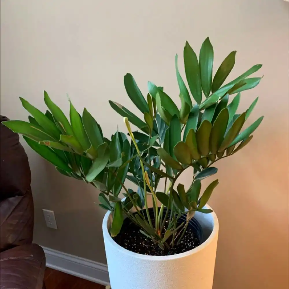 Окремі листочки при ширині до 5 см у довжину досягають 20 см, хоча кімнатні замиї найчастіше обмежуються листям у 3х8 см. Матове світло-зелене забарвлення у молодого листя поєднується з легким узліссем — сіруватим, шорстким нальотом, а часто і бронзовим або пурпуровим відливом. Черешки у замії найчастіше колючі.
