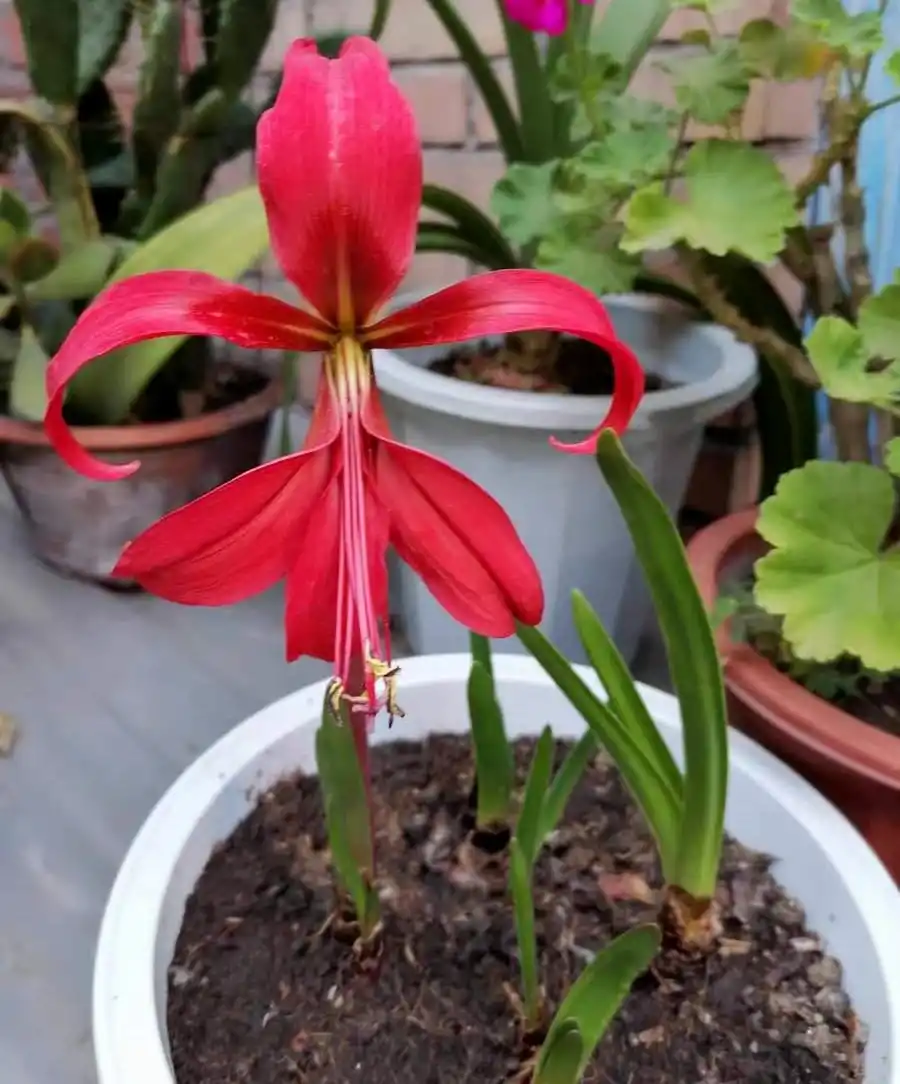 Трубка, яку утворюють три нижні частки оцвітини, тільки частково прикриває шість дуже довгих, з малиновими пильовиками і жовтим пилком, тичинок і ще більш довгий яскраво-червоний маточка.