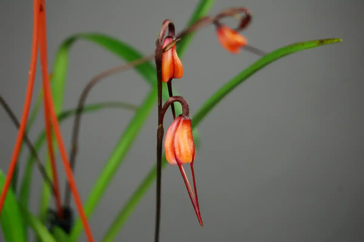 Дракула Бенедикта (Dracula benedictii) — вид з вишнево-винним, що зрісся в майже ідеально рівну чашку чашолистками, прикрашеними дуже довгими спіралеподібно закрученими хвостами і білою губою.
