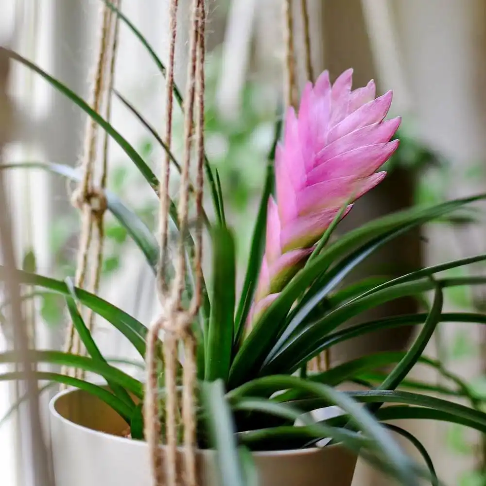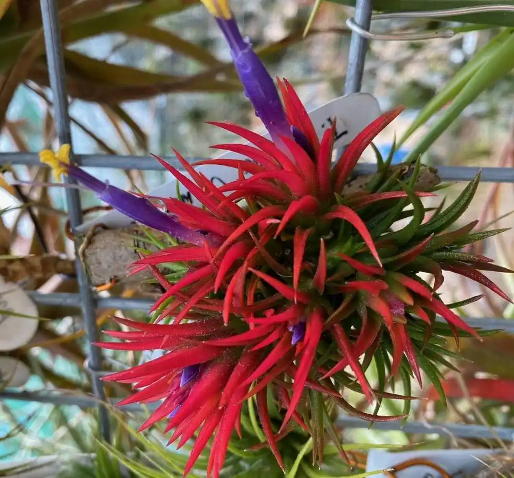 - тиландсія фіалкоквіткова (Tillandsia ionantha) — витончена розеточна рослина зі срібним, вигнутим листям, що червоніє під фіолетовим суцвіттям-колосом.