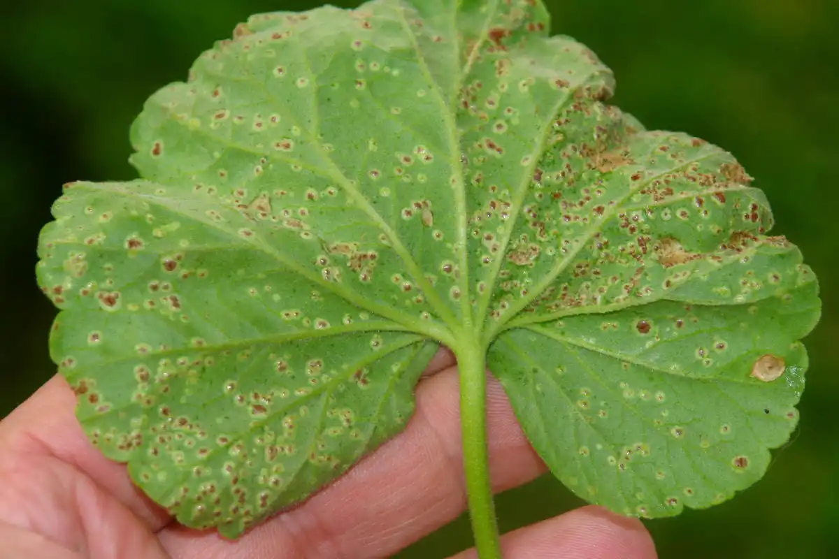 Зустрічається на кімнатних та й балконних пеларгоніях дуже рідко. Але якщо рослина страждає від відсутності провітрювань, та ще й утримується при дуже високій вологості повітря, дивуватися появі цієї хвороби не варто. Виявляється іржа в точкових іржаво-коричневих плямах, добре помітних на нижній стороні листя, а зверху вони проявляються як світлі, розпливчасто-акварельні плями, що розростаються з коричневими точками в центрі.