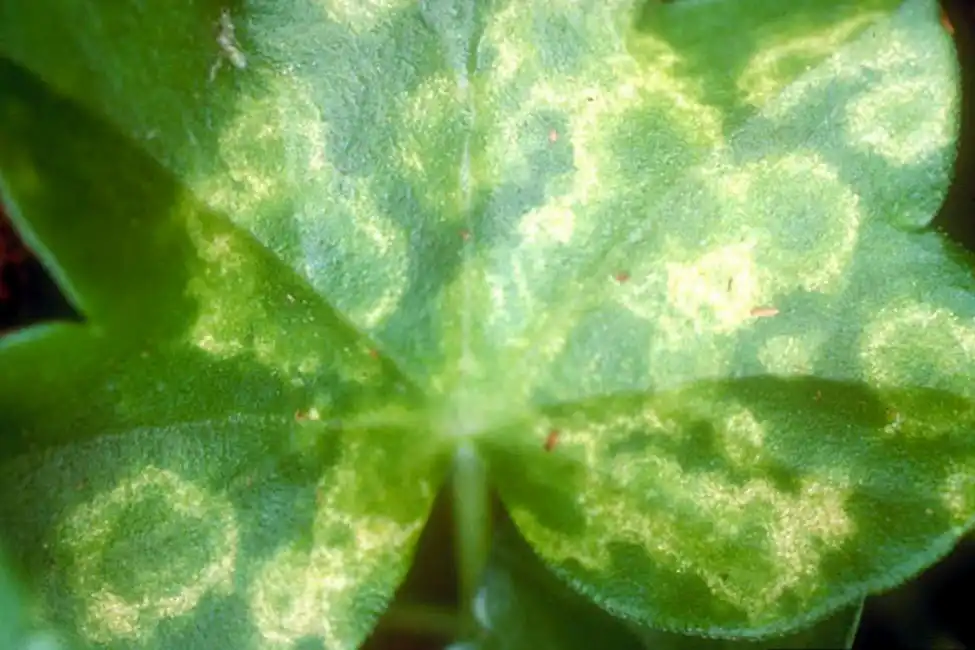 - кільцева плямистість (малюнок на листі нагадує кільця, припиняється зростання, цвітіння супроводжується деформацією);