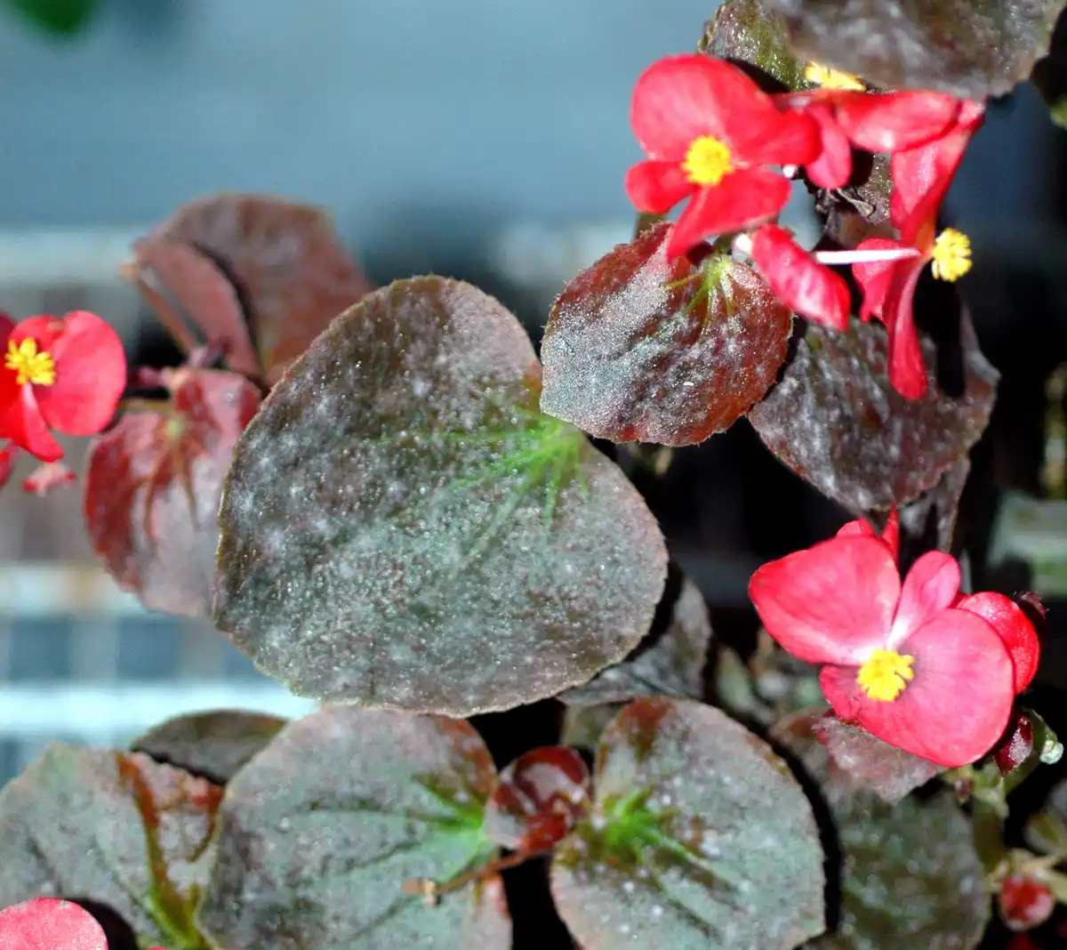 В останні роки це захворювання стало чи не найпоширенішим серед бегоній. Симптоми борошнистої роси прості в розпізнанні: білуватий наліт на черешках, квітконосах, листі, що поступово жовтіє і опадає — видовище малоприємне. А у квітучих красунь масово опадають ще й бутони.