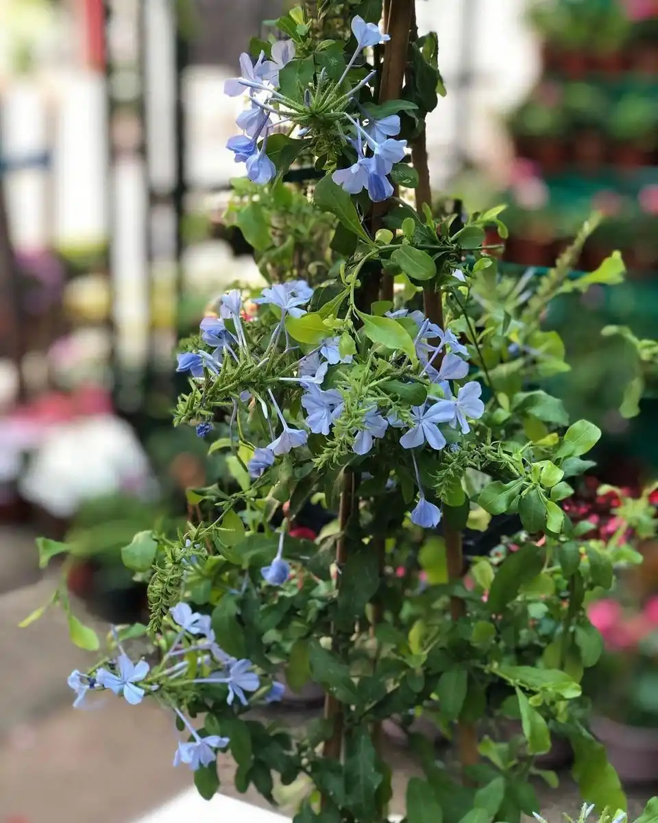 Плюмбаго, або Свинчатка вушкоподібна (Plumbago auriculata) — красивоквітучий, кучерявий вічнозелений чагарник з гнучкими пагонами до 2-х м у довжину, якому при стрижці надають кущисту форму. Без цього свинчатка розкидається на всі боки і створює химерні каскади та хмари. У неї невелике чергове овально-ланцетове листя до 5 см в довжину з незвичайною хвилястістю і текстурою, що нагадує папір. Частково опушена зворотна сторона листя здається сліпуче яскраво-трав'янистою.