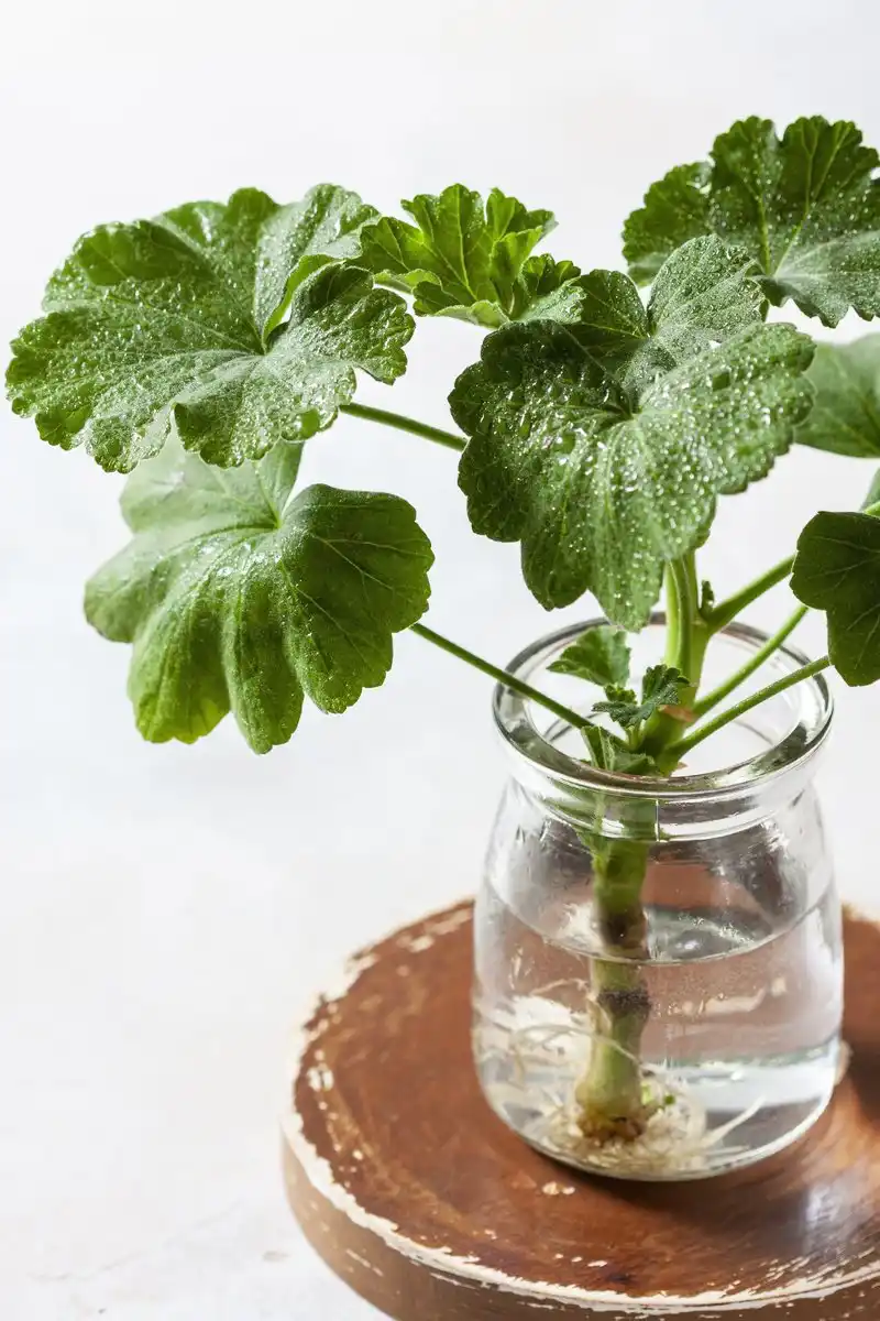 Живці пеларгонії немахрових сортів можуть укорінитися і у воді, у будь-якій прозорій ємності. Талу, фільтровану, дощову або просто відстояну воду наливають так, щоб низ живця був занурений на стандартні 2-2,5 см. І просто підтримують воду чистою, регулярно замінюючи її і доливаючи в міру випаровування. Можна додати дрібку вугілля для запобігання гнилям. Якщо низ живця підгниє, зрізи оновлюють, обробляють і ставлять у нову чисту воду.