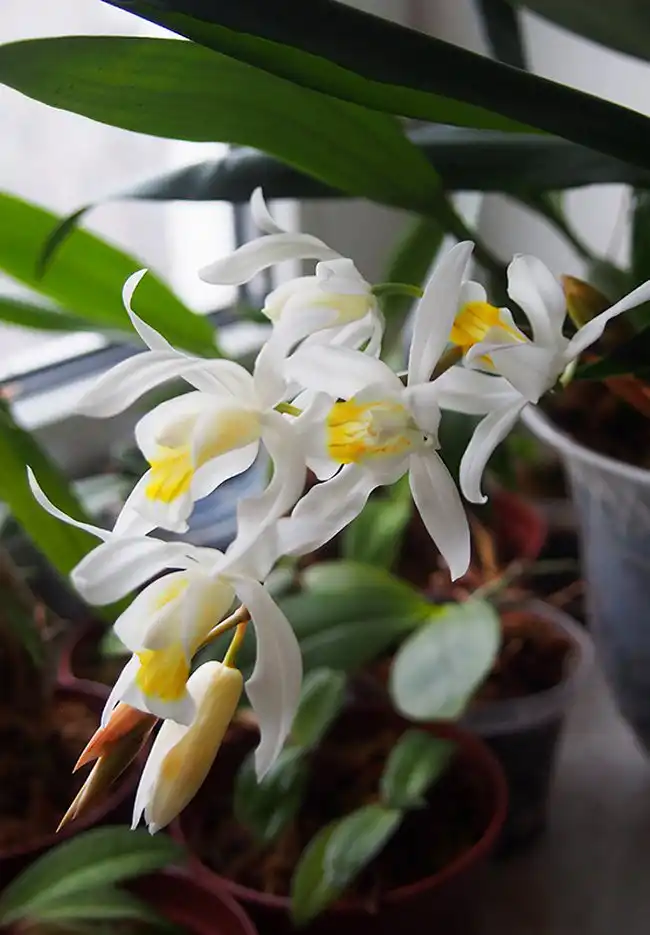 Целогіни (Coelogyne) — симподіальні епіфітні біло-жовті красуні з елегантними пензлями. Овальні дволисті псевдобульби і витончені, з гребенями на губі квітки - нагорода за прохолодну зимівлю і скромний догляд.