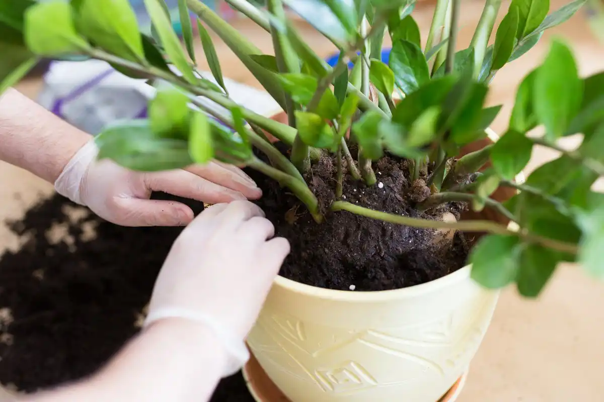 Заміокулькаси пересаджувати потрібно дуже акуратно. І бажано не одному, щоб було кому дбайливо притримувати розкішне листя і стежити за відсутністю травм. З корінням варто поводитися дуже акуратно, зберігаючи звичну для них неглибоку посадку. Земляна грудка краще не руйнувати.