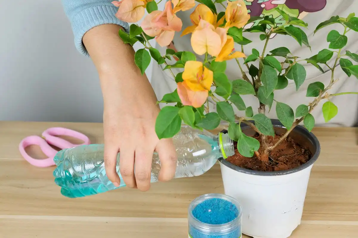 А ось чого бугенвілея справді не терпить, то це повного пересихання субстрату. У період активного зростання навіть легка нестача вологи позначиться на цвітінні. Але якщо рослину постійно піддавати різким коливанням вологості ґрунту, то на цвітіння можна також розраховувати. Поливати бугенвілею потрібно так, щоб підсихав тільки верхній шар ґрунту, але без ризику заболочування або загнивання, відразу зливаючи воду з піддонів. Навіть взимку повністю пересушувати земляну кулю не варто, але вологість ґрунту потрібно знизити в кілька разів.
