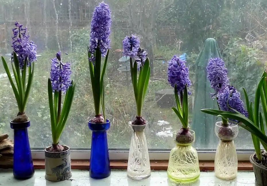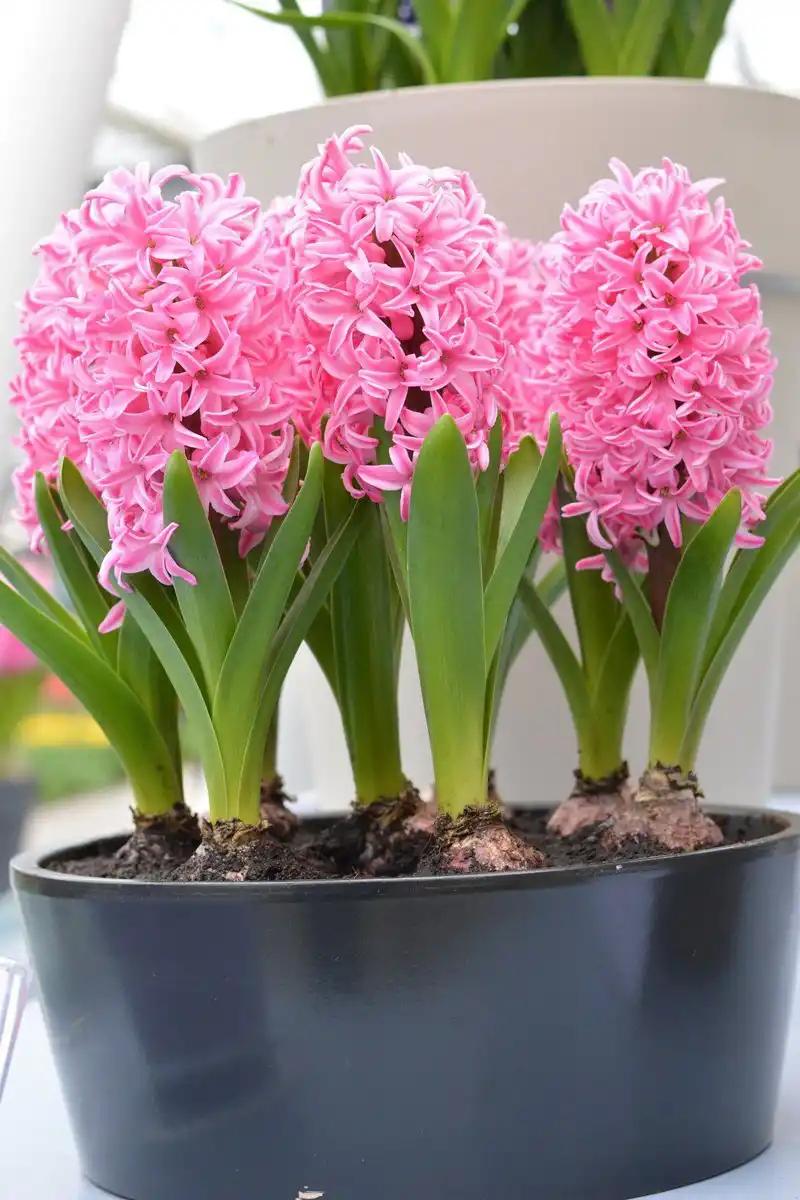 Гіацинти висаджувати значно легше, ніж інші кімнатні цибулинні. Великі цибулини і стандартні ємності - єдині для них варіанти при вирощуванні в ґрунті. Гіацинти найпростіше висаджувати по одній цибулинці, у горщиках діаметром 9-10 см з хорошими дренажними отворами. При посадці групою від стінок та між цибулинами залишають 2,5-3 см, розраховуючи кількість рослин по діаметру горщика.