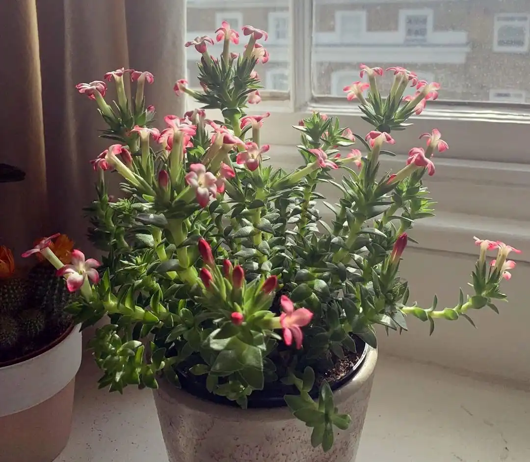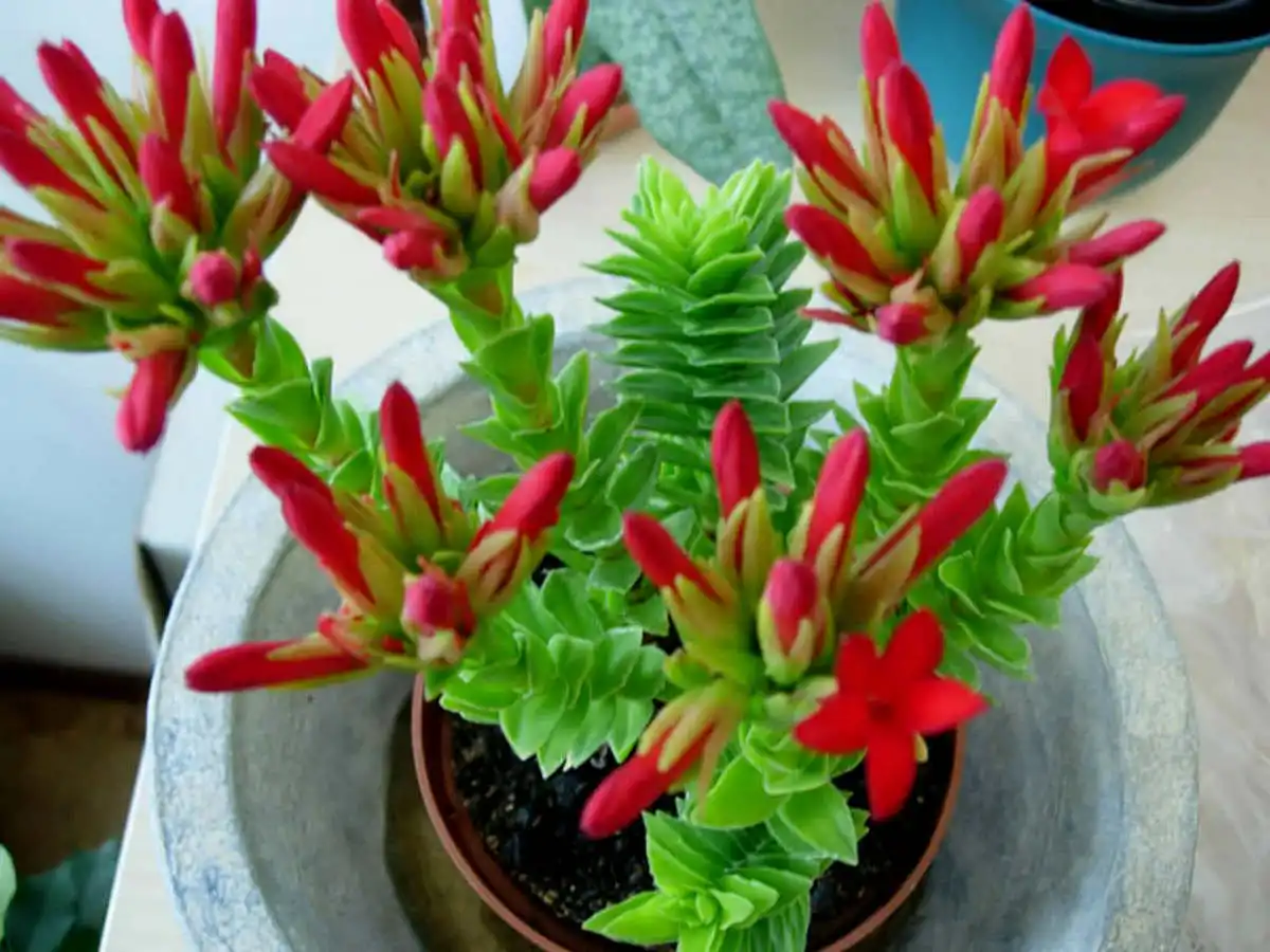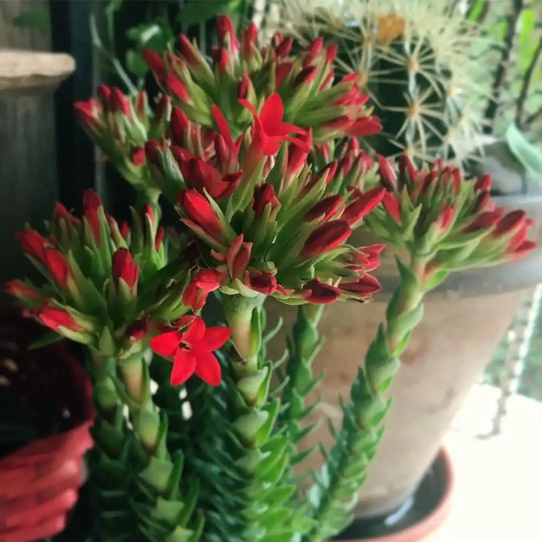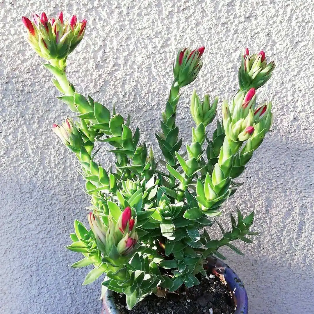 Екзотичний сукулент рохея з'явився на наших прилавках як альтернатива набридлому каланхое. І виявився цікавішим за багатьох сукулентів. Незважаючи на деяку схожість цвітіння, порівнювати рохеї з подібними рослинами було б великою помилкою. Химерні пагони з листям, що накладається хрест навхрест, заворожують своєю красою. Яскраві кущики ростуть повільно, але пагони-змійки стають все кращими з часом, а червоне цвітіння — все ряснішими. Рохея вимагає мінімального догляду та дуже довговічна. Достатньо лише дбати про її обрізання та підібрати оптимальні умови.