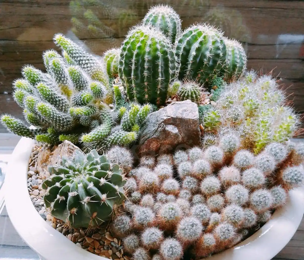 Коли на роботі пройшла мода на кактуси біля комп'ютерів, ми із колегами організували їм спільне проживання у спільній ємності. Засипали поверхню галькою та поставили на підвіконня. Кактуси – вдячні рослини, вони відповіли на таке переміщення життєрадісним виглядом, а наступного року зацвіли.