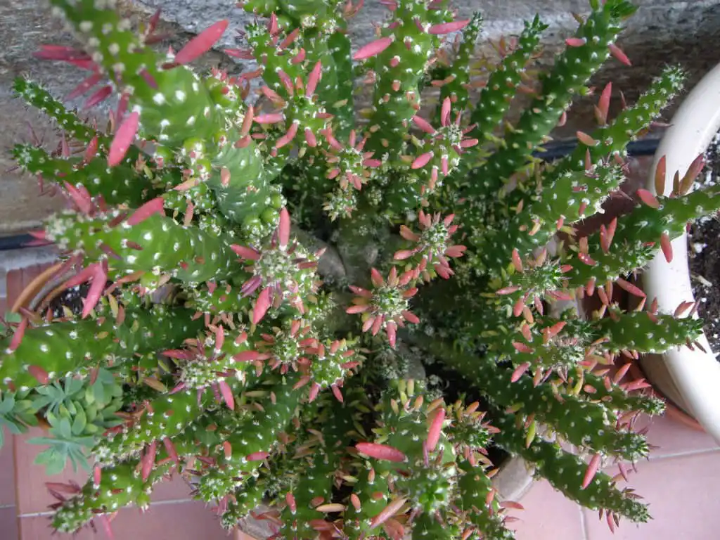 Стебла постійно подовжуються, але при літі на свіжому повітрі та загартовуванні низькими температурами кактус може залишатися мініатюрним, з короткими втечами. Красиві циліндричні листя довжиною до 3-х см швидко змінюються дрібними колючками.