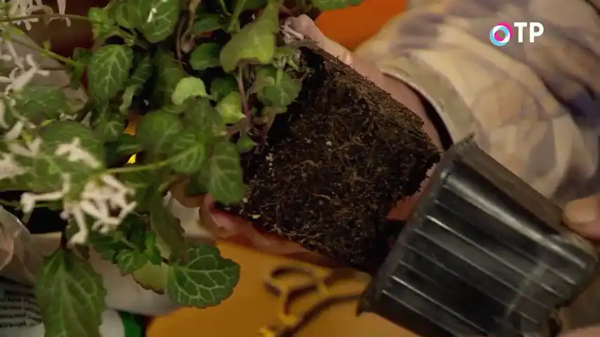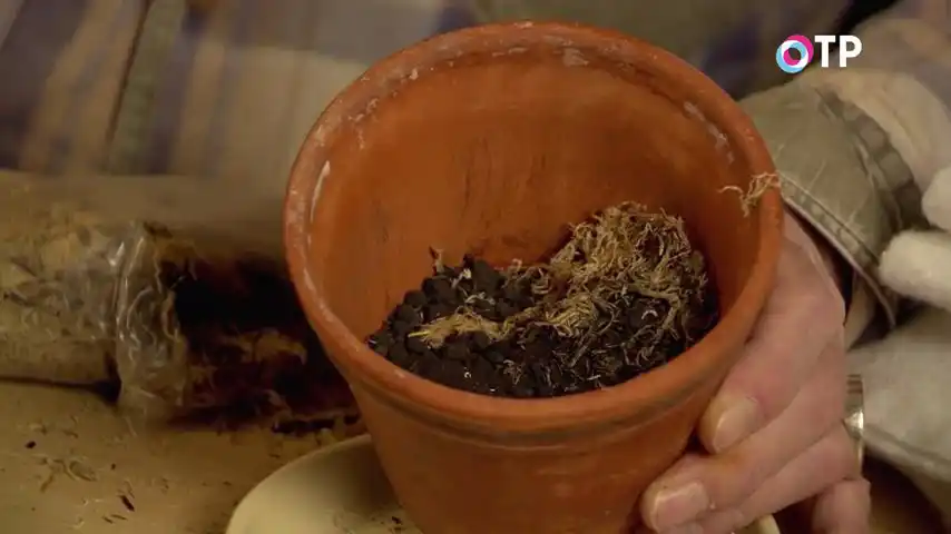 Ось подивіться. Зараз я витягну рослину з горщика. Акуратно ось так на денце. Бачите, як? Ось так на денце натискаю пальцем. Дістали рослину. Ось, яка грудка. Подивіться. Весь обплетений корінням. І, звичайно, йому тісно. Нічого страшного ми з ним не зробимо, якщо акуратно витягнемо з горщика, візьмемо горщик глиняний. Ці рослини люблять так, щоб повітря було в кореневій системі, води достатньо. А все разом створювало б дуже хороші повітро- та вологообмін.