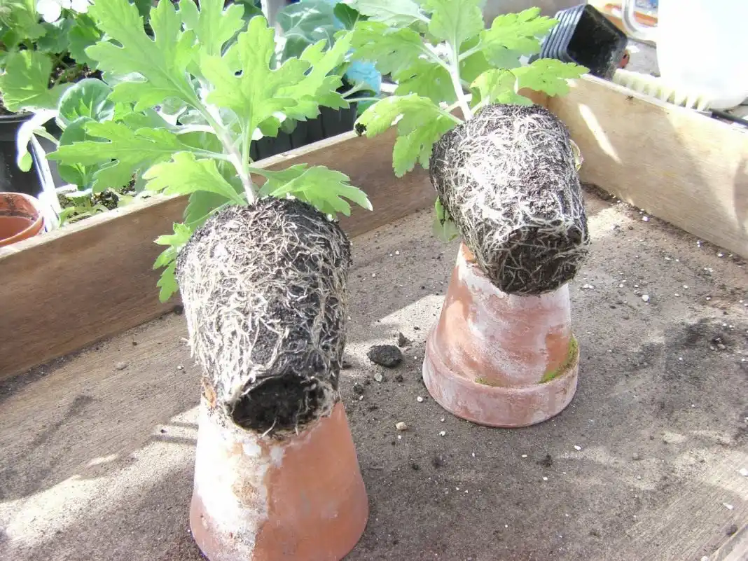 Живці хризантеми висаджуються неглибоко, на відстані близько 1 см. Рослини обприскують водою, але не поливають, під плівкою або склом пророщують у прохолодному місці при температурі близько 20 градусів тепла. Як тільки живці випустять перші коріння, їх розсаджують у невеликі горщики по одному, а потім підрослі рослини переносять у горщики побільше, для отримання більш пишних кущів, завжди розташовуючи їх по кілька штук в одній ємності.