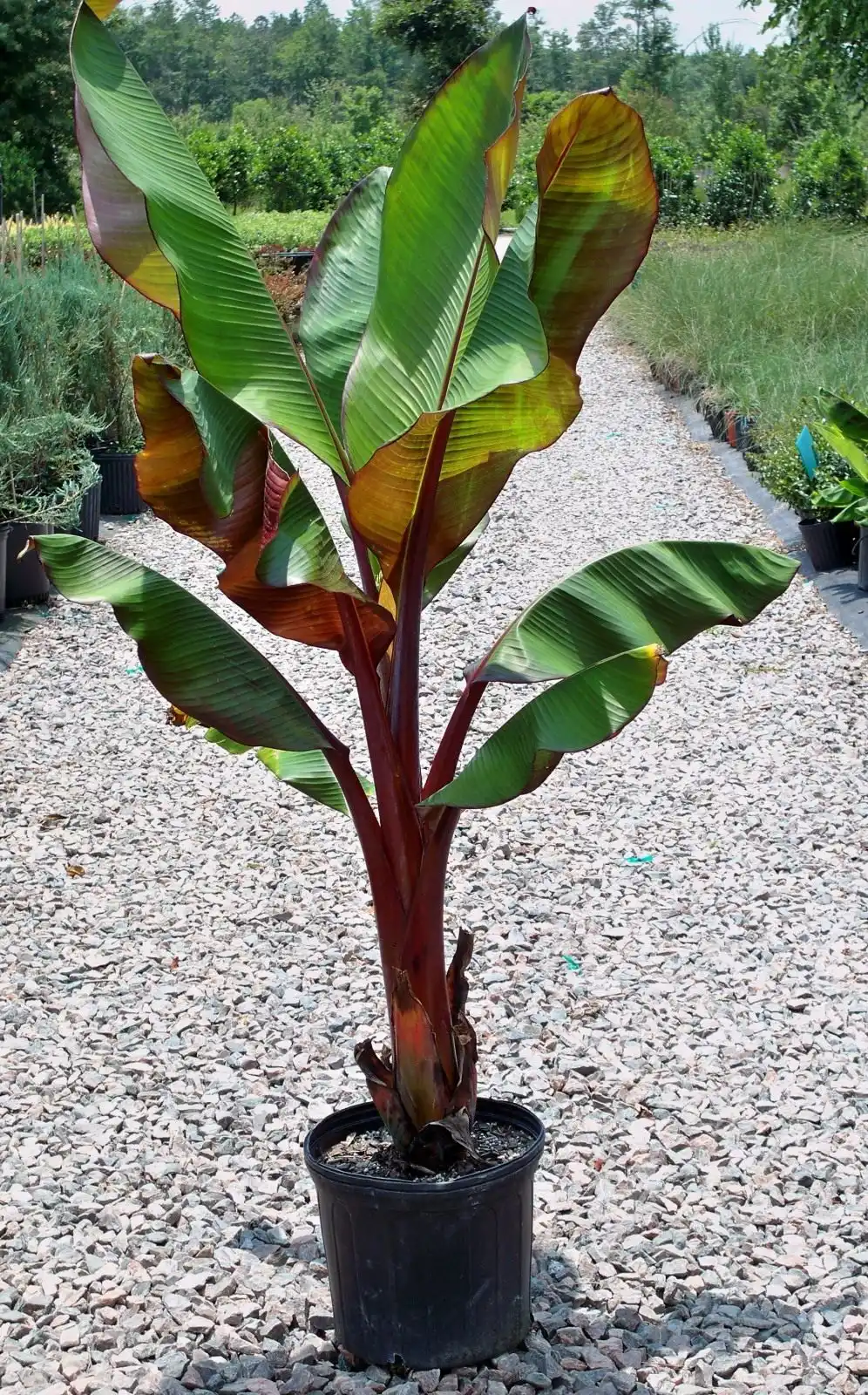 - Сніговий банан, або Енсета сиза (Ensete glaucum) красується жовто-зеленими стовбурами з покритими чорними плямами зовнішніми редукованими залишками старого листя і довгастим, менш широким листям, що сидить на коротких черешках.