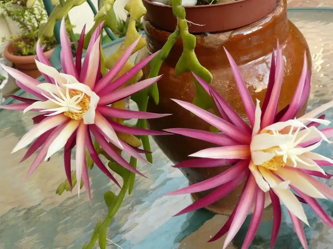 2. Селеніцереус Ентоні (Selenicereus anthonyanus) також прославився завдяки своєму народному імені «рибча кістка». Цей лазаючий кактус із чудовими листоподібними, м'ясистими стеблами шириною до 15 см і завдовжки кілька метрів і щоправда формою пагонів найбільше нагадує риб'ячі скелети. Плоскі стебла з досить яскравим забарвленням глибоко розсічені по краях на зразок листя дуба або кульбаби, але при цьому частки листа розташовані не парно, а короткі шипи в ареолах практично непомітні. Квітки цього кактуса напрочуд витончені і відрізняються яскравішим забарвленням, ніж у конкурентів.