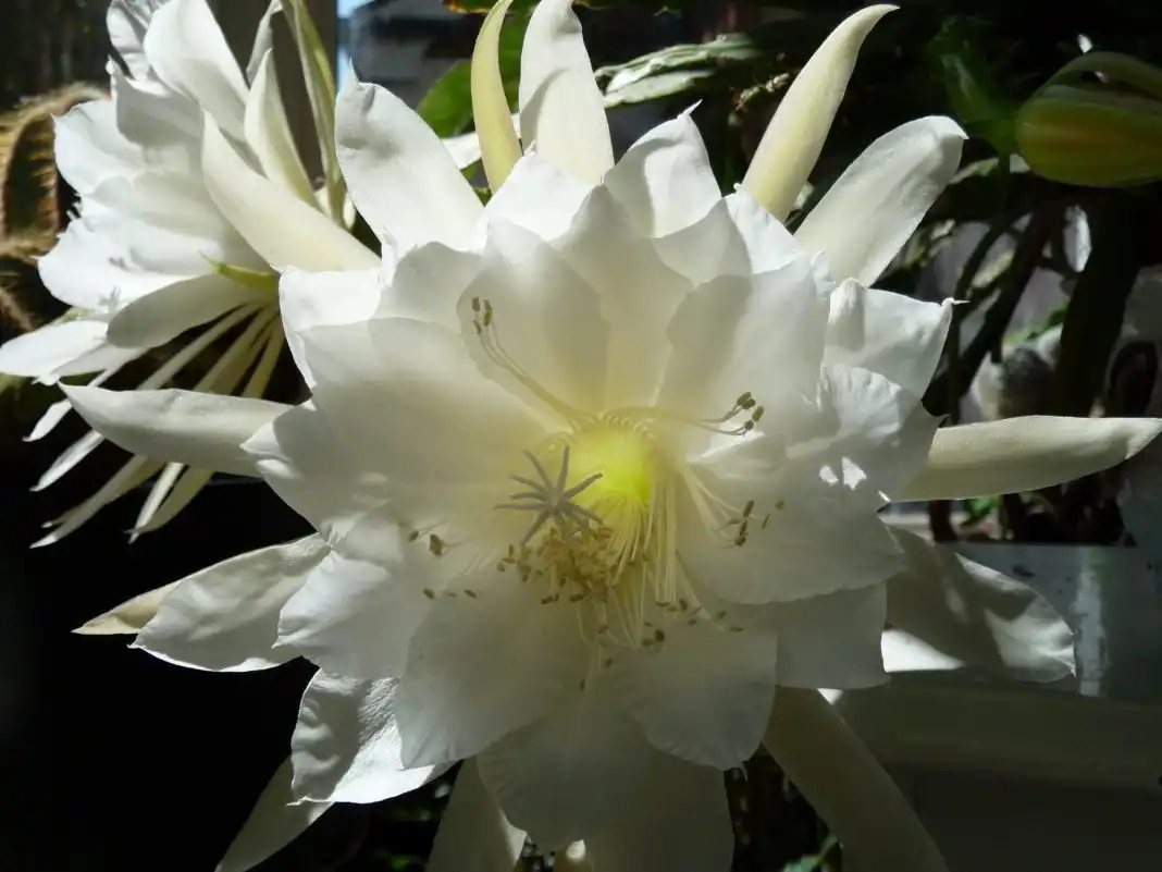 Поодинокі, пофарбовані в білий колір, вони досягають в діаметрі і в довжину до 30 см, розпускаються тільки з настанням сутінків і тримаються лише кілька годин до ранку. Тонкі, голкоподібні, численні частки оцвітини формують навколо внутрішньої вирви квітки з мовними пелюстками своєрідний ореол. Зовнішні пелюстки вузькі та довгі, внутрішні набагато ширші та короткі. Золотисто-жовтий колір крайових пелюсток тільки підкреслює сяючий білий центр квітки.