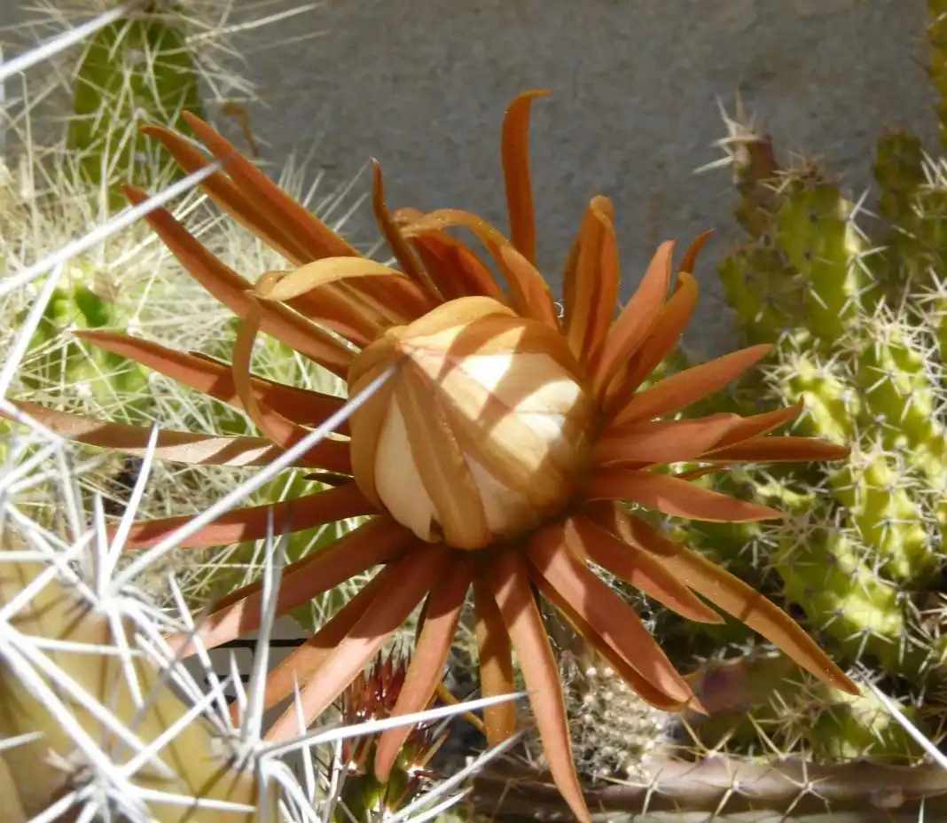 Колючки розташовані в ареолах рідко, дрібні, тонкі, вони відрізняються підвищеною чіпкістю. Відповідно незвичайно довгим пагонам і вражаючі своїм розмірам квітки. Інакше, ніж величезними, складні за структурою суцвіття цього виду кактусу не назвеш. Зовні вони дещо нагадують латаття, насправді є складними трубчастими суцвіттями з численними оцвітиками, що поділяються на сотні внутрішніх і зовнішніх пелюстків-часток. При цьому внутрішні пелюстки можуть формувати чашу, так і повністю заповнювати внутрішній простір квітки на кшталт хризантем. Голко-або ниткоподібні, зовнішні частини підкреслюють чашечку з ширших, мовоподібних часток оцвітини, створюючи відчуття подвійної структури квітки.