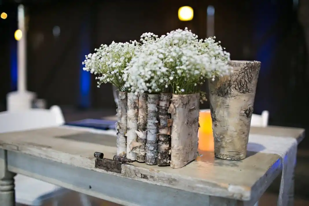 Сухі квіти, суцвіття, гілочки, ягоди, листя, плоди, відрізки кори та інший природний декор збирають у невеликі букетики і за допомогою клейового пістолета кріплять на поверхні попередньо забарвленого або простого горщика, а потім для надійності покривають лаком. Декор повинен бути мінімалістичним, невеликим: це не найдовговічніший варіант декорування, він не повинен заважати вільно пересувати горщик і брати його до рук.
