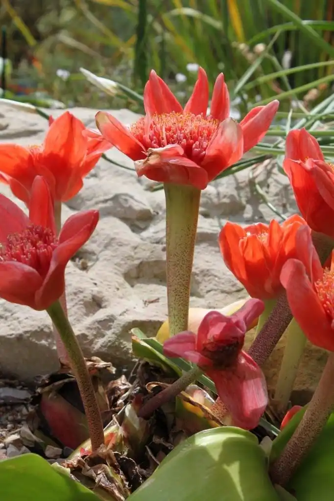 - Гемантус гранатний (Haemanthus puniceus) з десятисантиметровими кульками суцвіть шарлахового забарвлення і шкірястим, хвилястим листям;