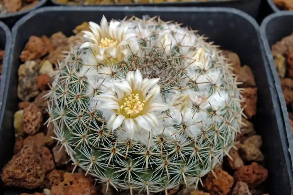 Забарвлення самих колючок вигідно підкреслюють і молоді густопухнасті ареоли, які створюють на кактусах ефект снігового або вовняного покриття. Цвітіння білих кактусів не можна назвати найефектнішим, але воно напрочуд витончено доповнює текстуру узлісся на самих рослинах. Подібні до мініатюрних зірочок і нагадують про різдвяних забарвлень зазвичай досить яскраві: квітки маммілярії пофарбовані в різні відтінки жовтого і рожевого, зрідка — червоного.