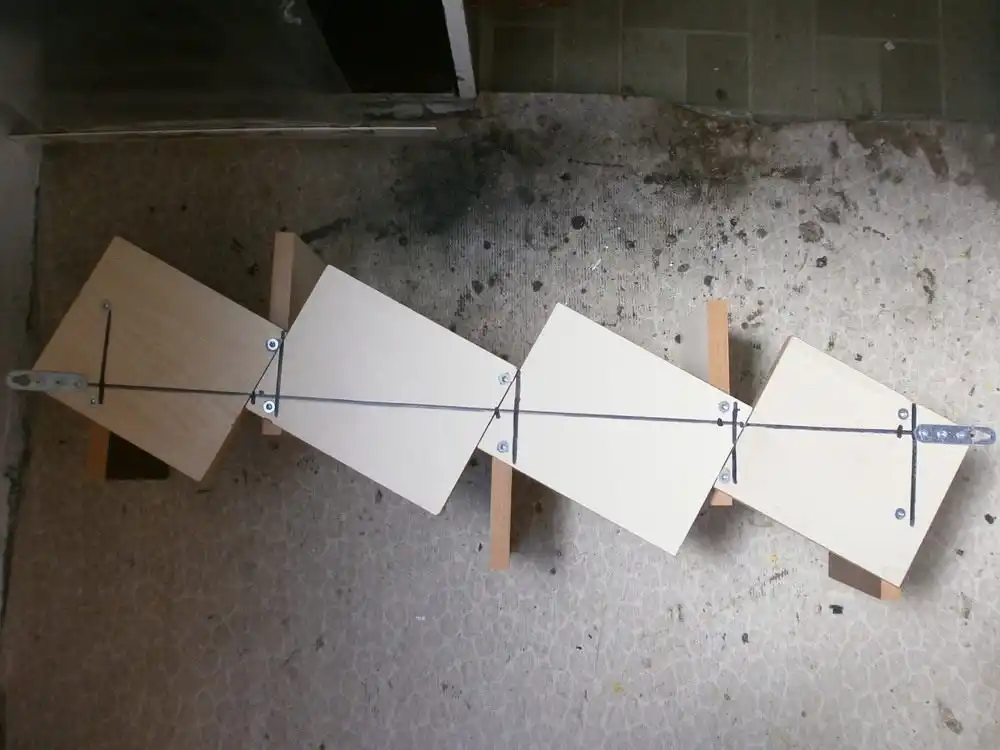 Вішаємо її, прикручуючи шурупами до щільної та рівної поверхні. Навіси навмисне прикрутили не потай, і навпаки, назовні, щоб шурупи натягували її. Так поличка для квітів навіть за необережного руху не злетить. Так я зробив вертикальну поличку для квітів. Тепер черга за вами.