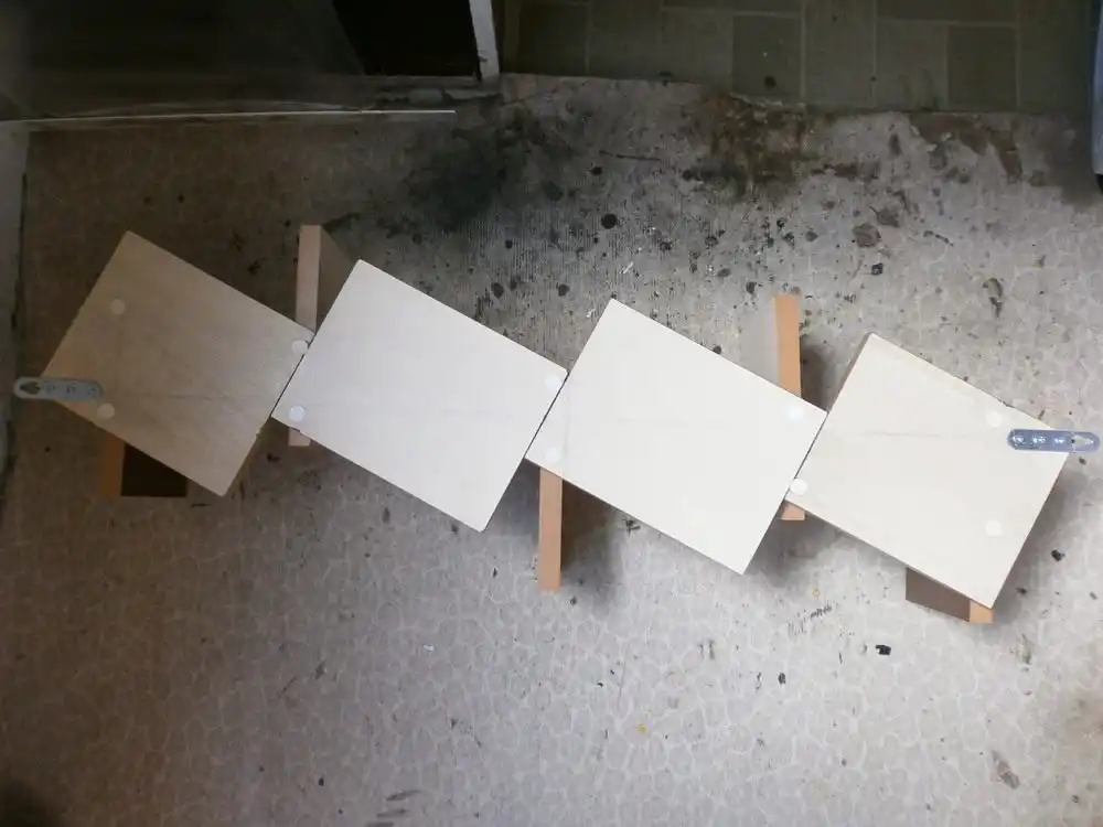 Насамперед мені знадобилися шматки ДСП. Я їх не купував, а у цеху, де розпилюють великі листи, завжди залишаються обрізки. Добрі пильщики дозволили їх набрати вдосталь, чим я не преминув скористатися. Ця поличка для квітів виготовлена з дев'яти фрагментів, розміром 14 на 20 сантиметрів. Хоча ви, якщо захочете повторити мій досвід, можете їх варіювати. І в цьому ви зараз переконаєтесь.