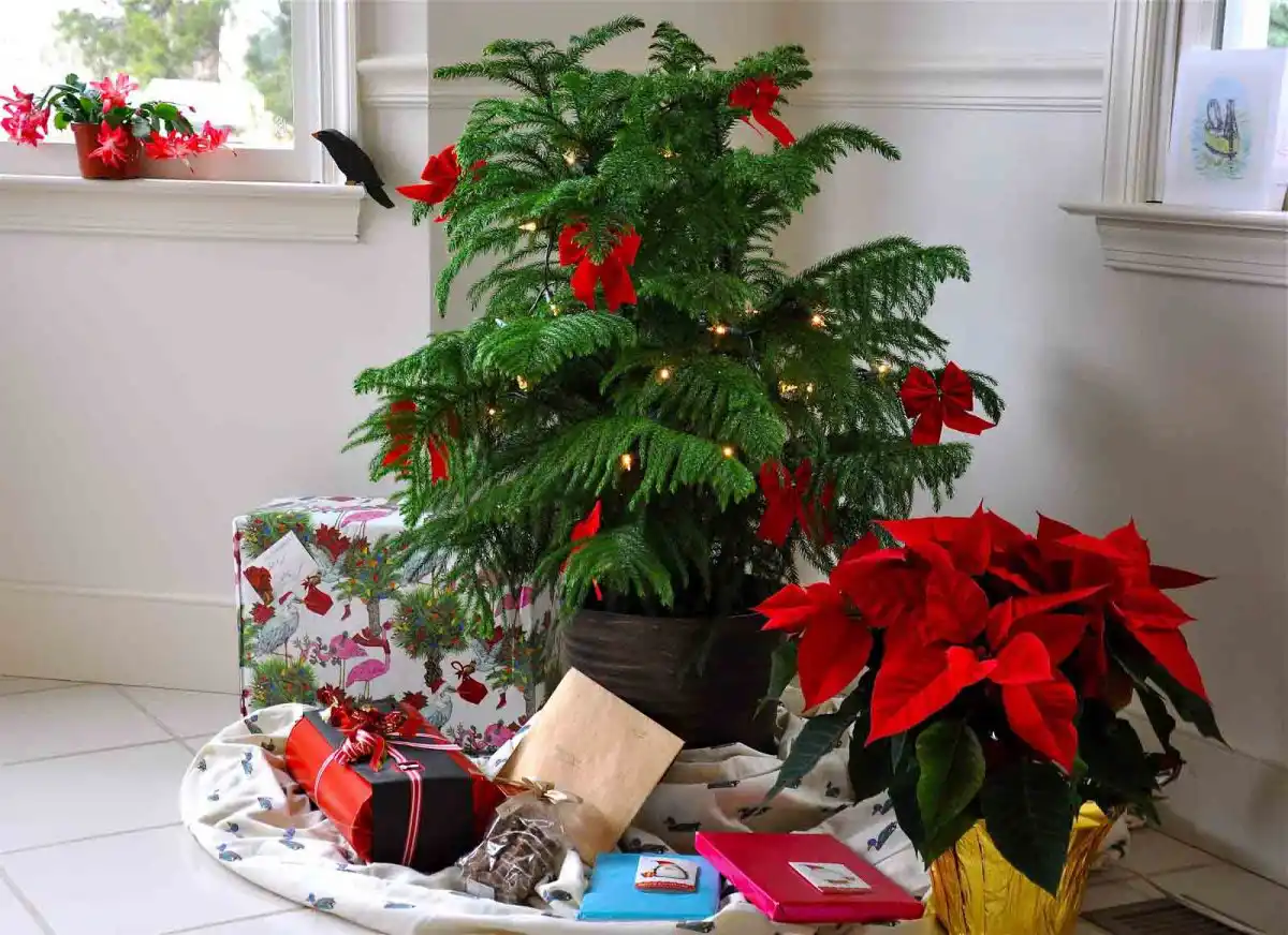 Ще один чудовий варіант, чим замінити звичну ялинку – араукарія. Чутки про її примхливість дуже перебільшені. Вона буде мальовничим доповненням до будь-яких кімнатних квітів цілий рік. А в новорічному оздобленні по красі та пишноті нітрохи не поступається живій ялині.
