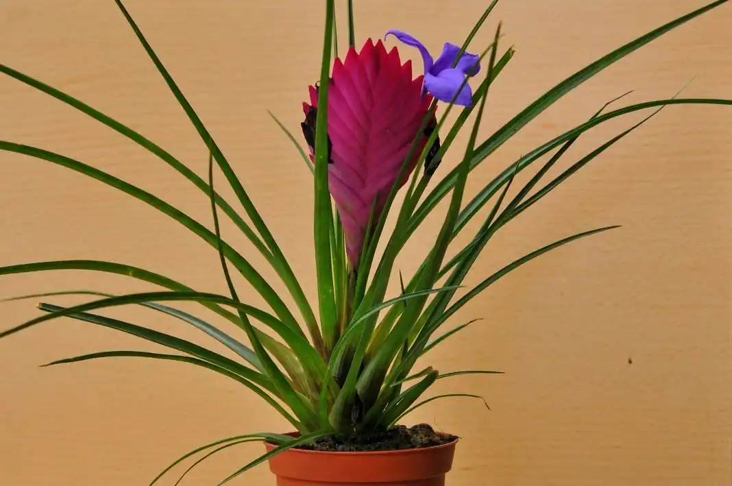 Тіландсія «Голова медузи» (Tillandsia caput-medusae). Відігнуте закручене товсте листя в основі – цибулини здуті та розширені. Влітку утворюються квітки червоного кольору з синіми приквітками.