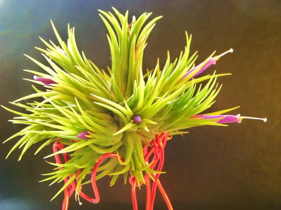Тіландсія фіалкоквіткова (Tillandsia ionantha). Сріблясте вигнуте листя створює компактні розетки. Влітку при появі невеликих колосоподібних суцвіть синьо-фіолетового кольору внутрішні листя розеток червоніють.