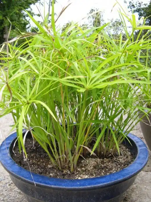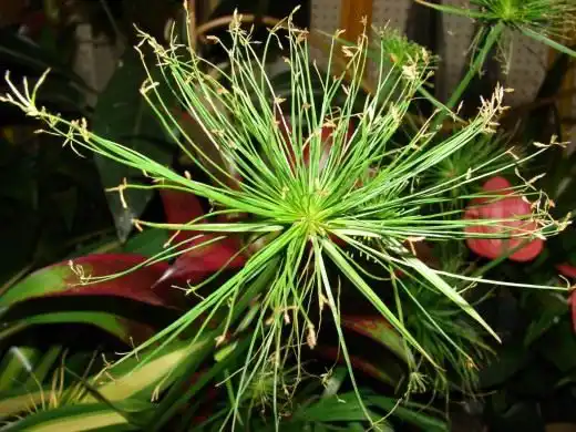 То що це за рослина? Циперус папірус (Cyperus papyrus) - багаторічна трав'яниста рослина висотою до 5 м. Папірус у горщику нагадує оазис з пальмами в мініатюрі. Стебла прямі, міцні, у верхній частині тригранні, що завершуються дуже густою розеткою довгого листя, що звисає. Величезні зонтикоподібні суцвіття діаметром 90 см, знайомі нам за давньоєгипетськими зображеннями, в кімнатах, на жаль, не утворюються.